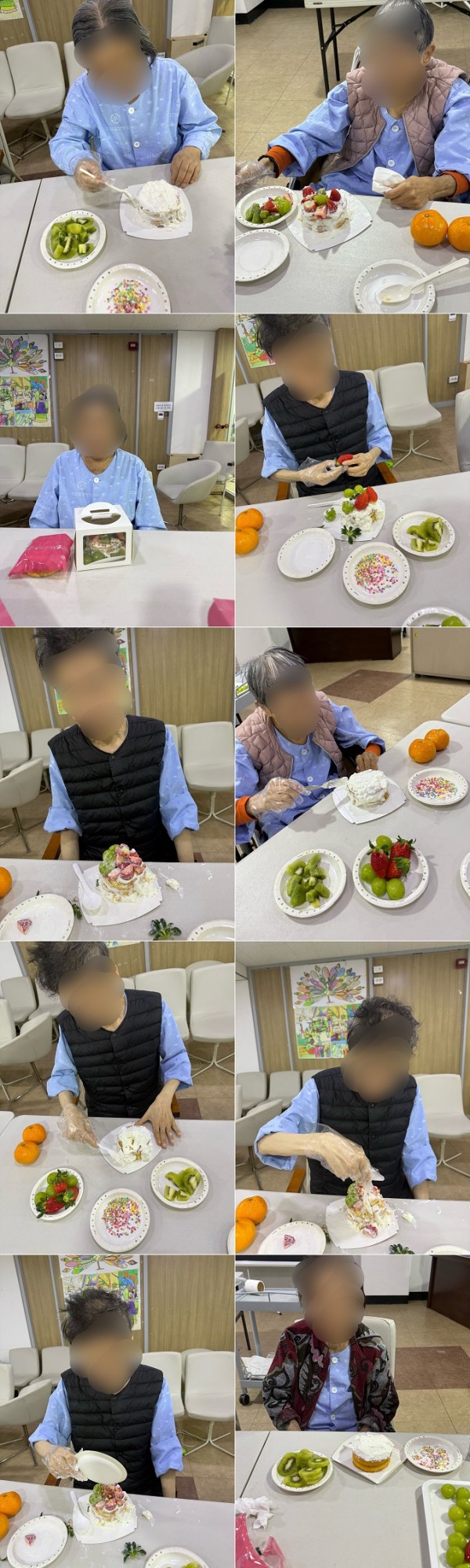 어르신들께서는 직접 케이크를 꾸미며 예전에 가족들과 함께 케이크를 나누던 따뜻한 추억을 떠올리셨고, 완성된 케이크를 맛보시며 미소를 지으셨습니다.