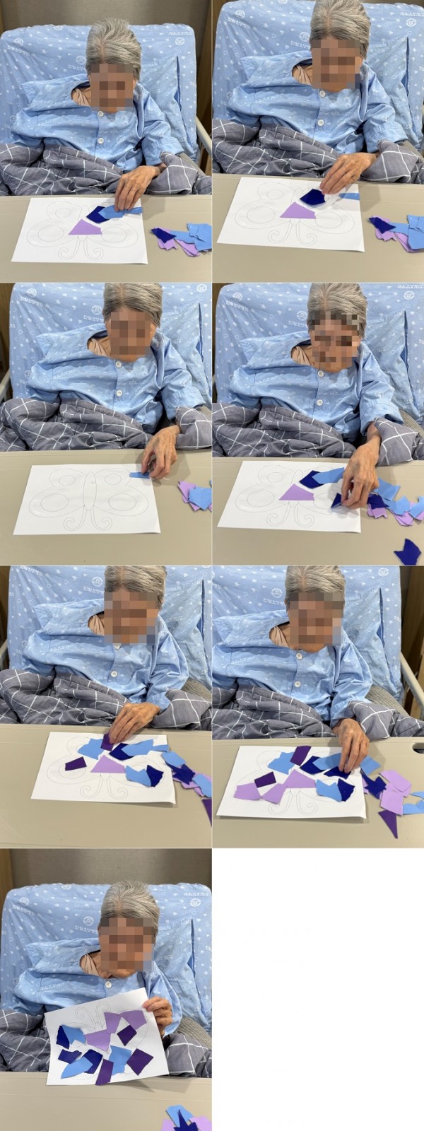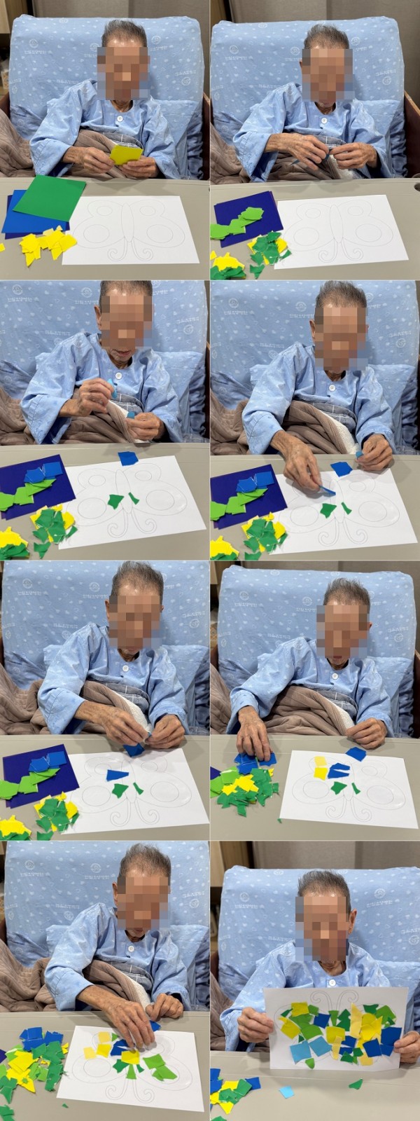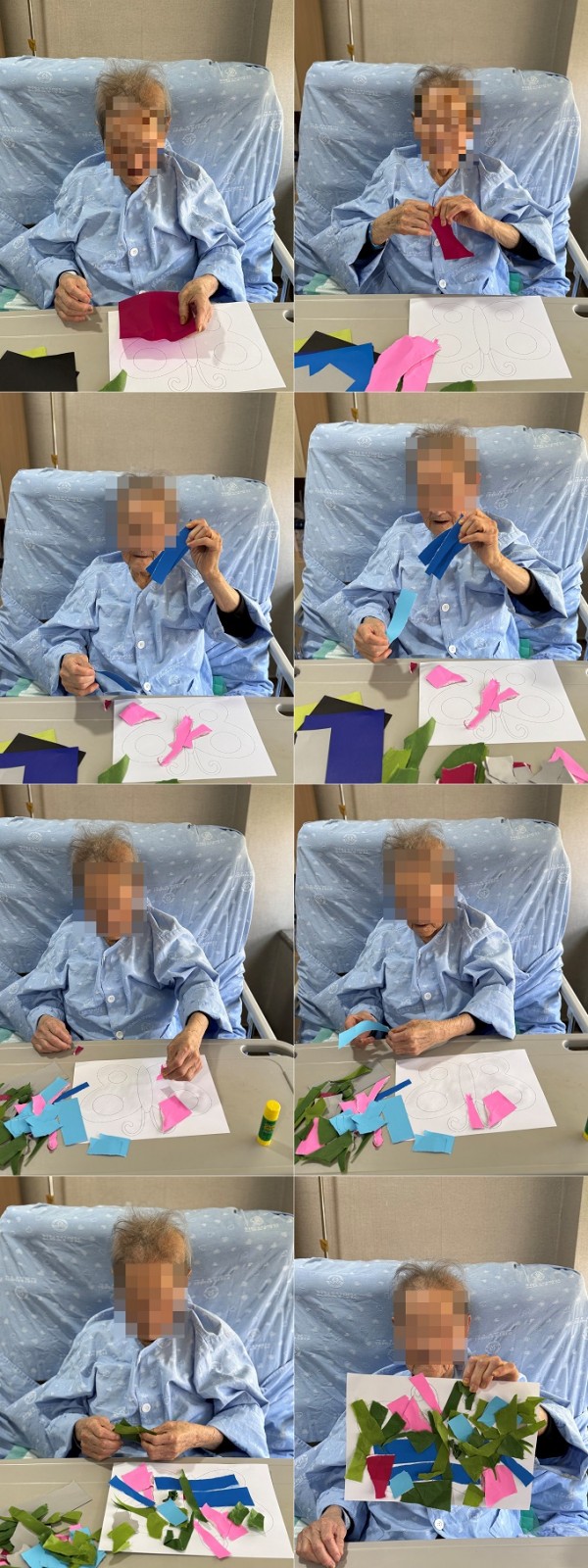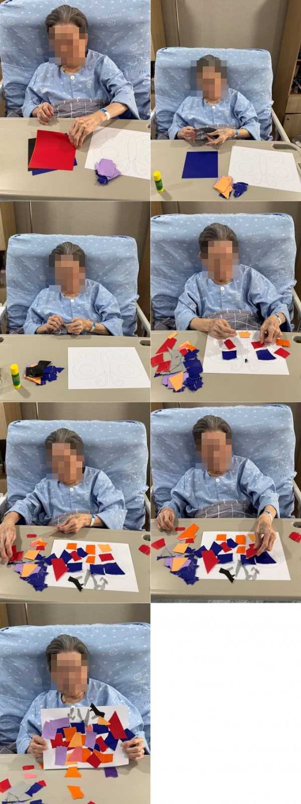 활동 방법은 간단합니다. 색종이를 손으로 찢어 나비 도안 위에 붙이는 것으로, 처음에는 종이를 찢는 것이 아깝다며 망설이시는 분들도 계셨습니다. 하지만 사회복지사의 시범을 보고 나서는 웃음과 즐거움 속에서 자유롭게 종이를 찢고 풀로 붙이며 나비를 꾸미셨습니다.