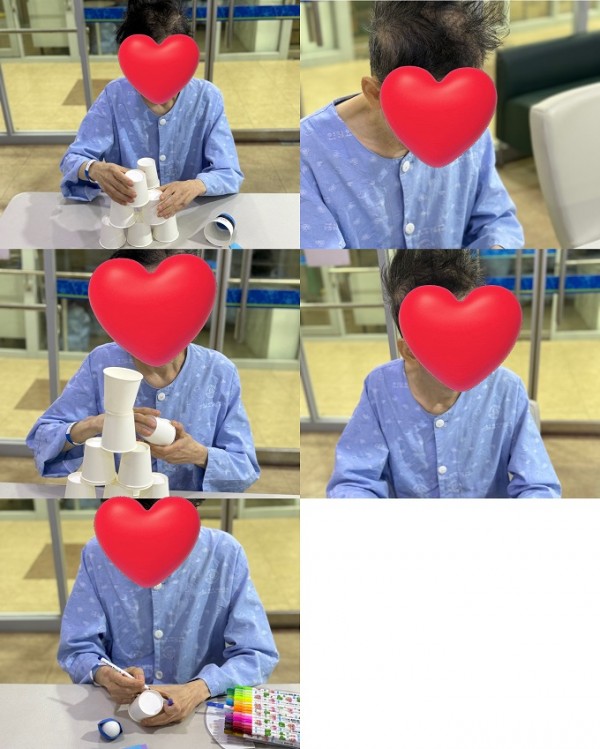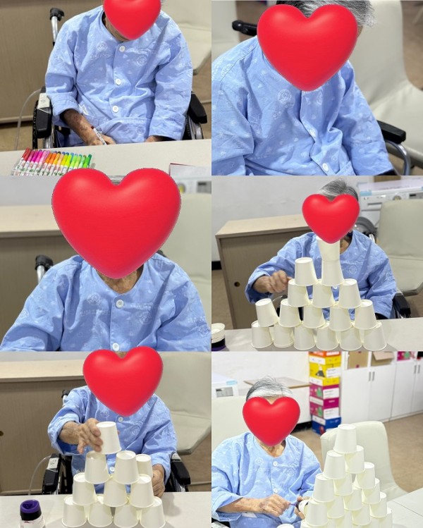 마음속에 있는 고민,화나는일 속상한일을 이야기하며 종이를 찢어 폭죽을 터트리고.종이컵을 이용하여 높은 탑을 쌓으며 폭죽으로 무너트는 활동을 통해 어르신들의 스트레스 해소와 정서적 안정을 도왔습니다.