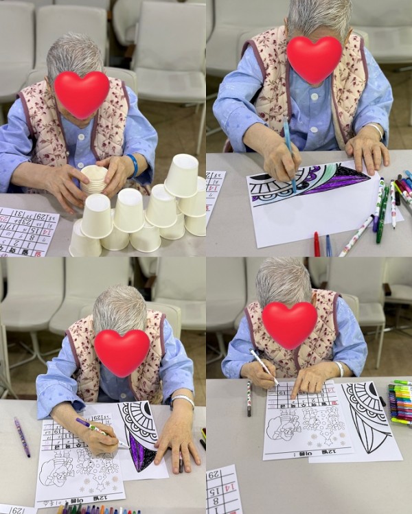 어르신들께서는 손끝으로 색칠하며 소근육을 사용하고, 날짜를 적으며 자연스럽게 인지활동도 하실 수 있어 매우 의미 있는 시간이 되었습니다.