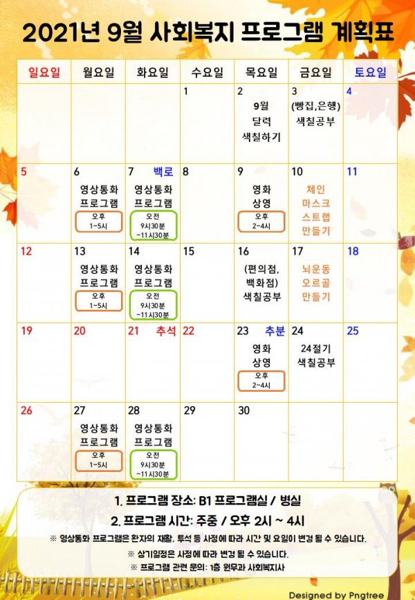 2021년 9월 사회복지 프로그램 계획표 페이지 정보 작성자 최고관리자 작성일21-09-01 14:40 조회7,872회 댓글0건 관련링크 이전글 다음글 본문 2021년 9월 사회복지 프로그램 계획표 입니다. ※배경 참고: pngtree.com 목록