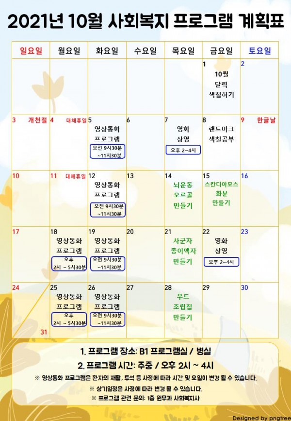 2021년 10월 사회복지 프로그램 계획표 페이지 정보 작성자 최고관리자 작성일21-10-02 17:06 조회8,063회 댓글0건 관련링크 이전글 다음글 본문 2021년 10월 사회복지 프로그램 계획표 입니다. ※배경 참고: pngtree.com 목록