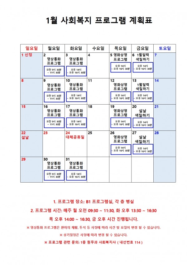 2023년 1월 프로그램 계획표 페이지 정보 작성자 최고관리자 작성일23-01-06 17:59 조회6,437회 댓글0건 관련링크 이전글 다음글 본문 2023년 1월 프로그램 계획 목록