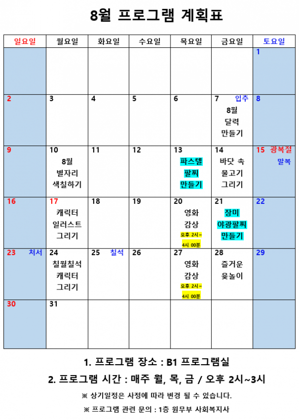 2020년 8월 사회복지 프로그램 계획표 페이지 정보 작성자 최고관리자 작성일20-08-10 16:22 조회8,550회 댓글0건 관련링크 이전글 다음글 본문 2020년 8월 사회복지 프로그램 계획표 입니다.^^ 목록