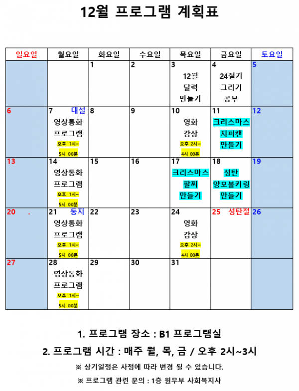 2020년 12월 사회복지 프로그램 계획표 페이지 정보 작성자 최고관리자 작성일20-12-02 09:48 조회8,218회 댓글0건 관련링크 이전글 다음글 본문 2020년 12월 사회복지 프로그램 계획표입니다. 목록