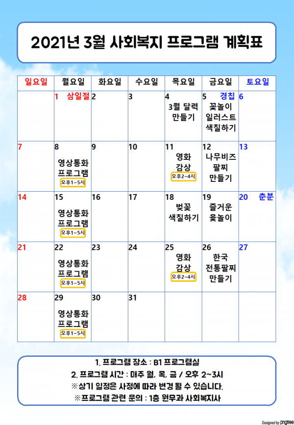 2021년 3월 사회복지 프로그램 계획표 페이지 정보 작성자 최고관리자 작성일21-03-02 10:31 조회8,423회 댓글0건 관련링크 이전글 다음글 본문 2021년 3월 사회복지 프로그램 계획표 입니다. ※배경 참고: pngtree.com 목록