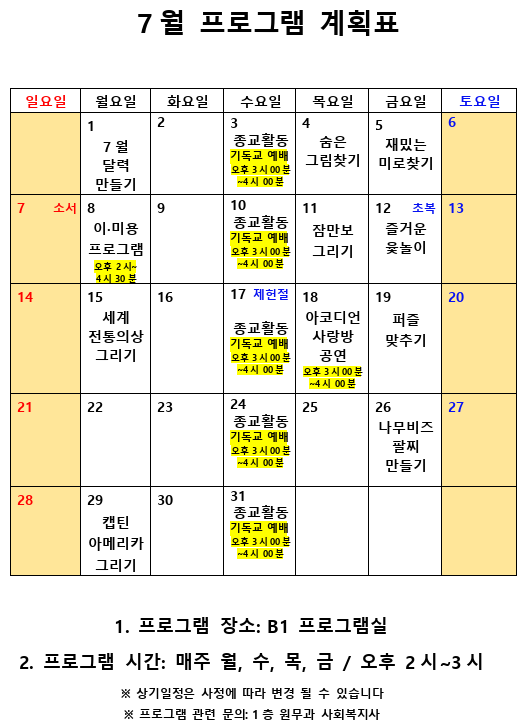 2019년 7월 사회복지 프로그램 계획표 페이지 정보 작성자 최고관리자 작성일19-07-01 10:04 조회8,648회 댓글0건 관련링크 이전글 다음글 본문 2019년 7월 사회복지 프로그램 계획표 입니다.^^ 목록