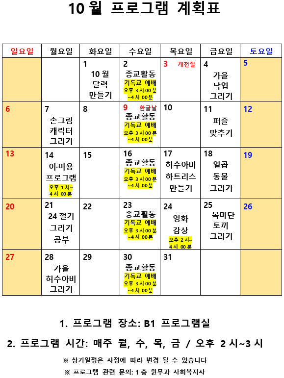 2019년 10월 사회복지 프로그램 계획표 페이지 정보 작성자 최고관리자 작성일19-10-01 15:49 조회8,486회 댓글0건 관련링크 이전글 다음글 본문 2019년 10월 사회복지 프로그램 계획표 입니다. 목록