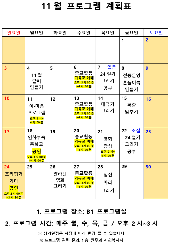 2019년 11월 사회복지 프로그램 계획표 페이지 정보 작성자 최고관리자 작성일19-11-04 09:14 조회8,361회 댓글0건 관련링크 이전글 다음글 본문 2019년 11월 사회복지 프로그램 계획표 입니다.^^ 목록