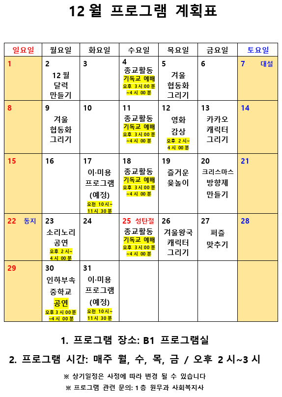 2019년 12월 사회복지 프로그램 계획표 페이지 정보 작성자 최고관리자 작성일19-12-03 11:48 조회8,443회 댓글0건 관련링크 이전글 다음글 본문 2019년 12월 사회복지 프로그램 계획표입니다. 목록