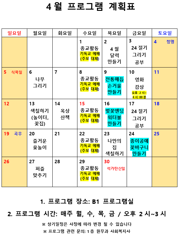 2020년 4월 사회복지 프로그램 계획표 페이지 정보 작성자 최고관리자 작성일20-04-01 16:25 조회8,508회 댓글0건 관련링크 이전글 다음글 본문 2020년 4월 사회복지 프로그램 입니다.^^ 목록