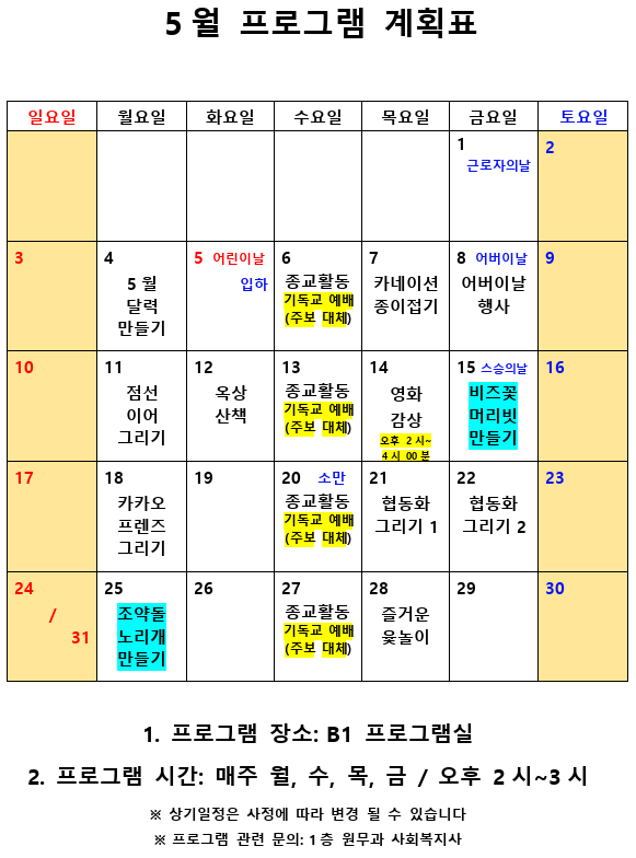 2020년 5월 사회복지 프로그램 계획표 페이지 정보 작성자 최고관리자 작성일20-05-14 09:17 조회8,351회 댓글0건 관련링크 이전글 다음글 본문 2020년 5월 사회복지 프로그램 계획표입니다.^^ 목록