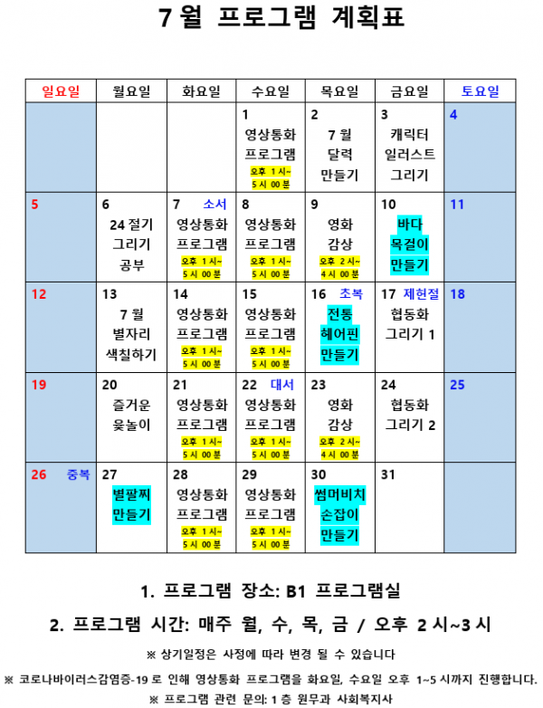 2020년 7월 사회복지 프로그램 계획표 페이지 정보 작성자 최고관리자 작성일20-07-03 16:10 조회8,143회 댓글0건 관련링크 이전글 다음글 본문 2020년 7월 사회복지 프로그램 계획표 입니다.^^ 목록