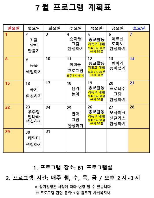 7월 사회복지 프로그램 계획표 페이지 정보 작성자 최고관리자 작성일18-07-03 15:51 조회8,677회 댓글0건 관련링크 이전글 다음글 본문 7월 사회복지 프로그램 계획표 목록