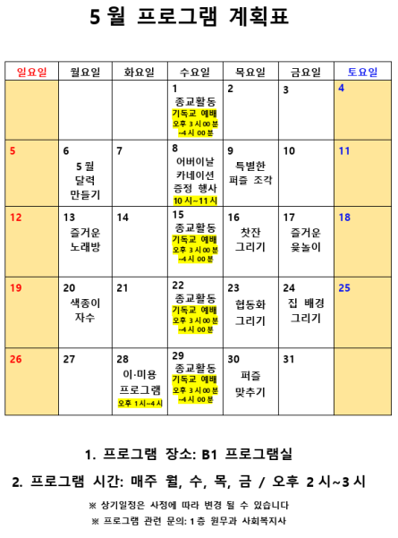 2019년 5월 사회복지 프로그램 계획표 페이지 정보 작성자 최고관리자 작성일19-05-17 16:25 조회8,366회 댓글0건 관련링크 이전글 다음글 본문 2019년 5월달 사회복지 프로그램 계획표(수정) 입니다.^^ 목록