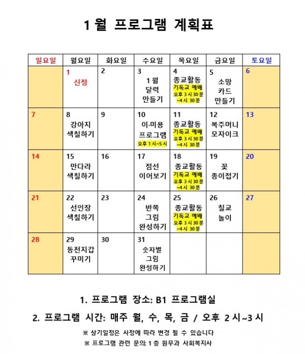 1월 사회복지 프로그램 계획표 페이지 정보 작성자 최고관리자 작성일18-01-18 13:30 조회9,431회 댓글0건 관련링크 이전글 다음글 본문 <2018년 1월 사회복지 프로그램 계획표> 목록