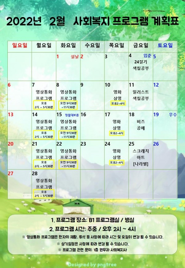 2022년 2월 사회복지 프로그램 계획표 페이지 정보 작성자 최고관리자 작성일22-02-07 10:18 조회8,257회 댓글0건 관련링크 이전글 다음글 본문 2022년 2월 사회복지 프로그램 계획표 입니다. ※배경 참고: pngtree.com 목록