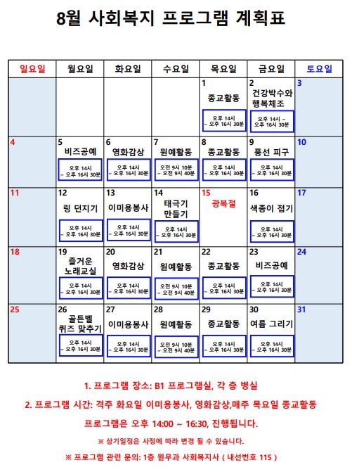 2024년 8월 프로그램 계획서 페이지 정보 작성자 최고관리자 작성일24-08-05 16:54 조회3,831회 댓글0건 관련링크 이전글 다음글 본문 2024년 8월 프로그램 계획서입니다. 감사합니다. 목록