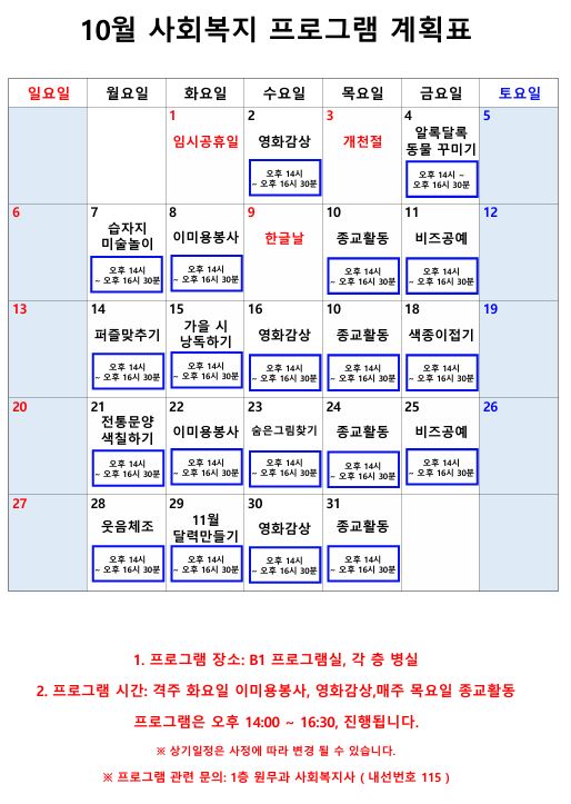 2024년 10월 프로그램 계획서 페이지 정보 작성자 최고관리자 작성일24-09-30 10:58 조회3,168회 댓글0건 관련링크 이전글 다음글 본문 2024년 10월 프로그램 계획서입니다. 감사합니다. 목록
