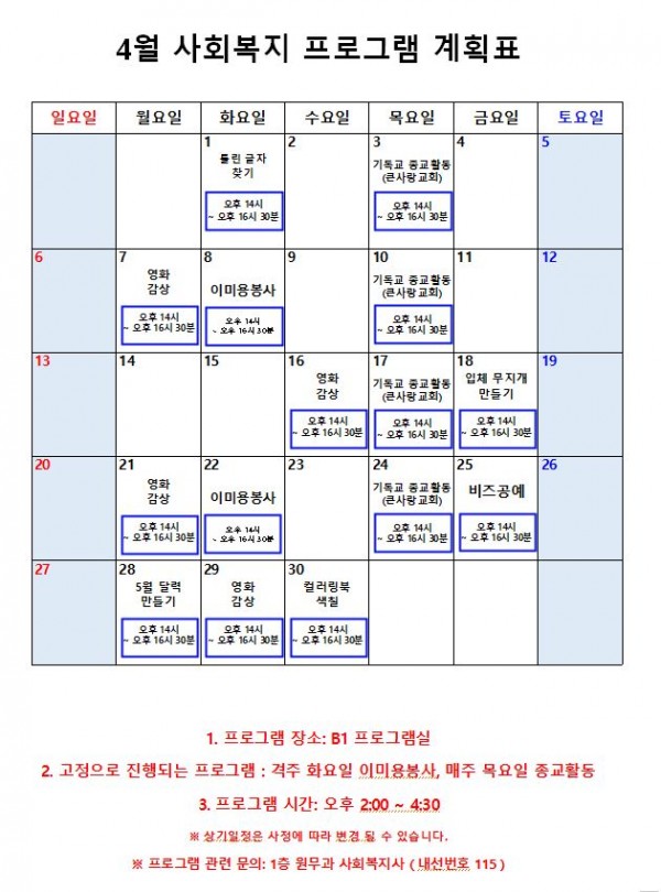 2025년 4월 프로그램 계획표 페이지 정보 작성자 최고관리자 작성일25-04-04 14:32 조회1,254회 댓글0건 관련링크 이전글 다음글 본문 2025년 4월 프로그램 계획표입니다. 감사합니다. 목록