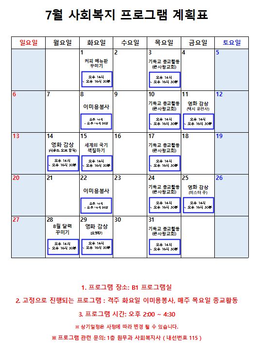 2025년 7월 프로그램 계획표 페이지 정보 작성자 최고관리자 작성일25-07-01 09:45 조회953회 댓글0건 관련링크 이전글 다음글 본문 2025년 7월 프로그램 계획표입니다. 감사합니다. 목록