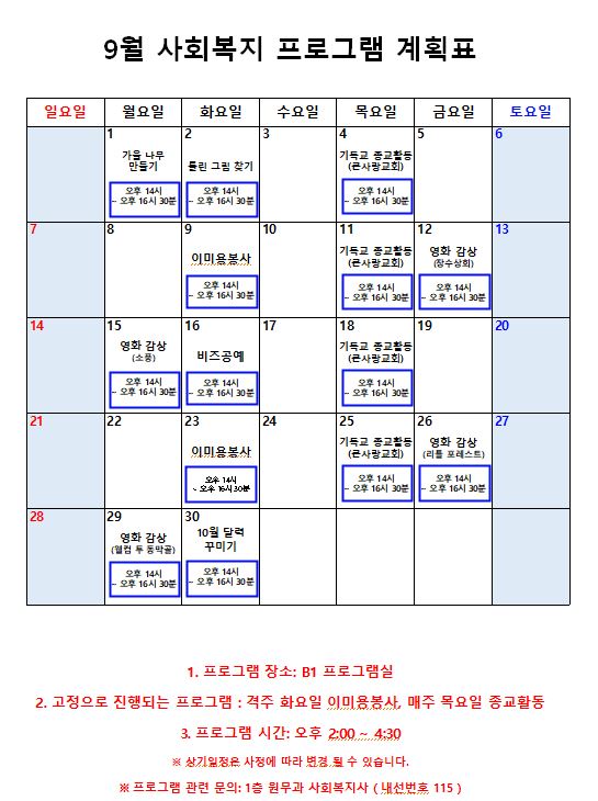 2025년 9월 프로그램 계획표 페이지 정보 작성자 최고관리자 작성일25-09-01 13:00 조회679회 댓글0건 관련링크 이전글 다음글 본문 2025년 9월 프로그램 계획표입니다. 감사합니다. 목록