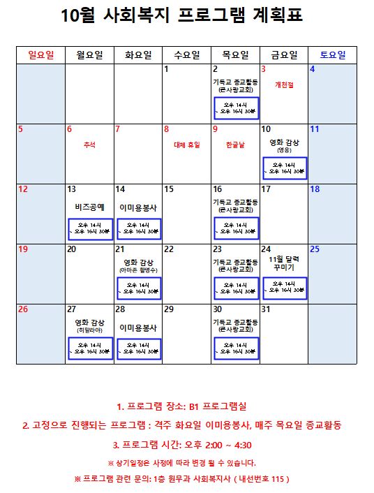2025년 10월 프로그램 계획표 페이지 정보 작성자 최고관리자 작성일25-10-01 09:21 조회480회 댓글0건 관련링크 다음글 본문 2025년 10월 프로그램 계획표입니다. 감사합니다. 목록